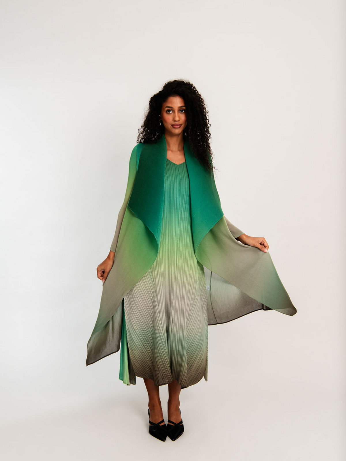 A signature Alquema silhouette, the Collare Coat in Ombre is a timeless expression of colour, movement, and craftsmanship. Crafted from 100% chiffon, this lightweight, slightly sheer layer features a cascading waterfall collar, long sleeves, and a midi-length hemline. The pleated design brings sculptural texture and graceful fluidity, while the ombré dye technique creates a seamless wash of shifting tones. Stylish yet versatile, it’s a striking companion to dresses or separates, perfect for layering with poise and ease.