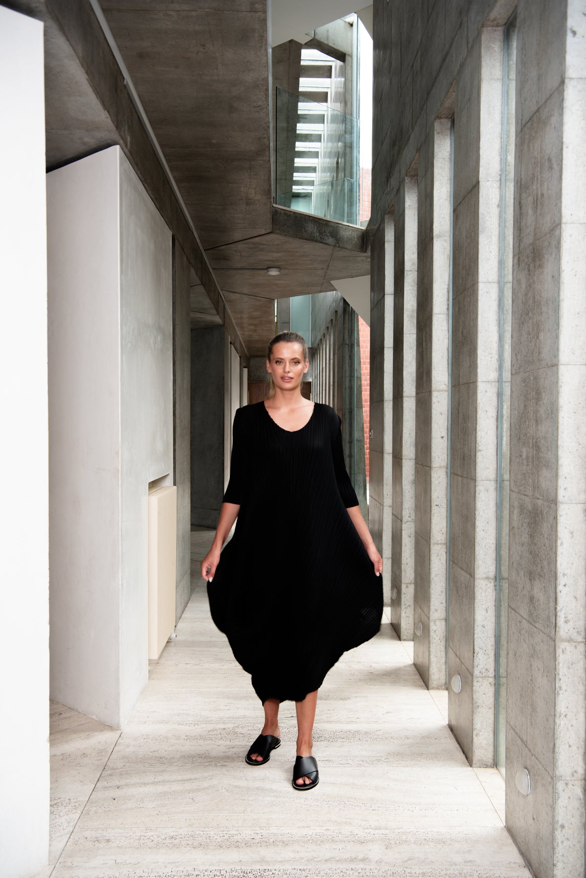 A dress to match your creativity, our Draper Dress is structural and captivating with its dynamic hem. Straight pleating throughout and mirrored in the 3/4 sleeves, this V neck artwork will be your go to dress for any occasion.