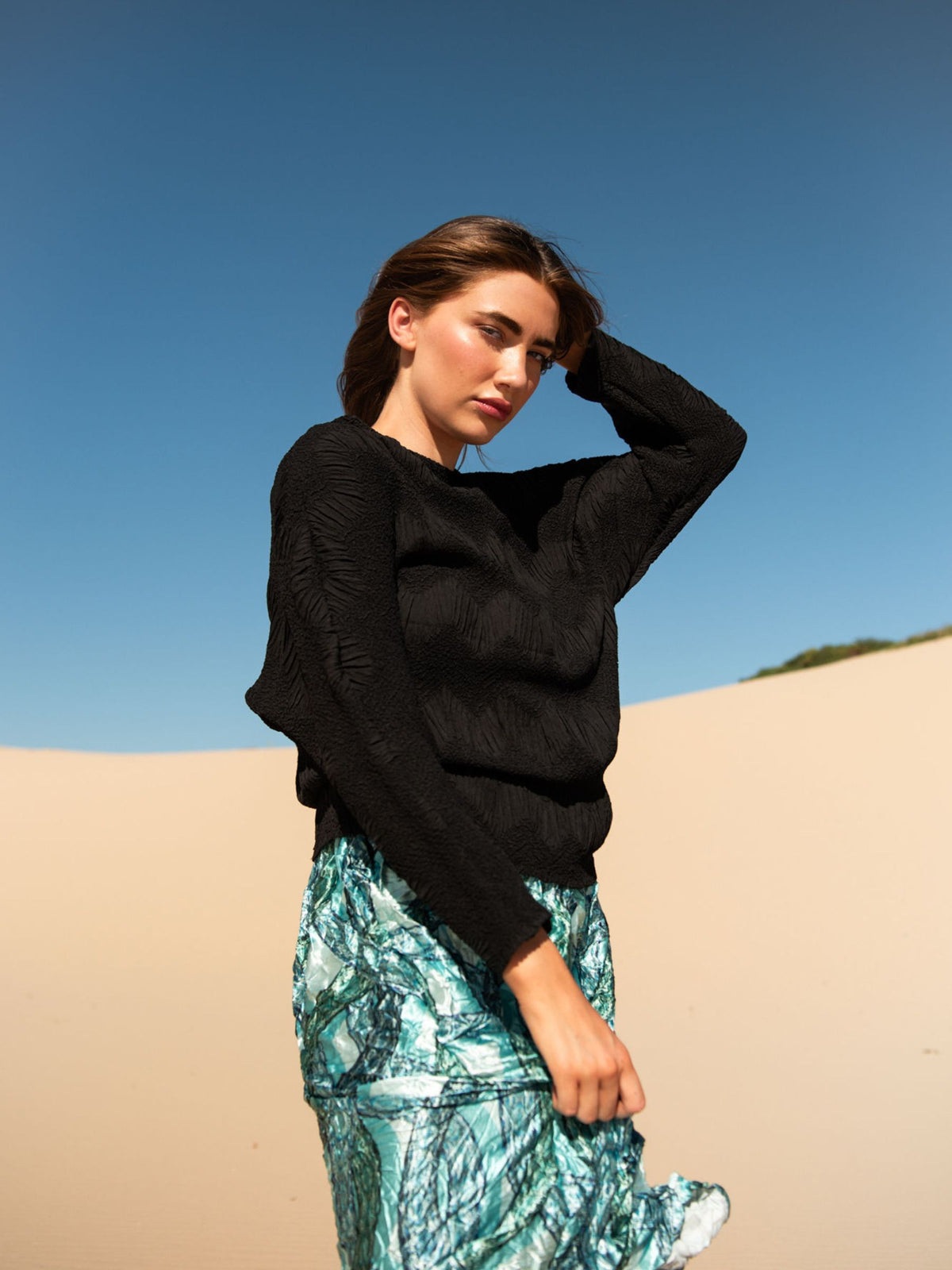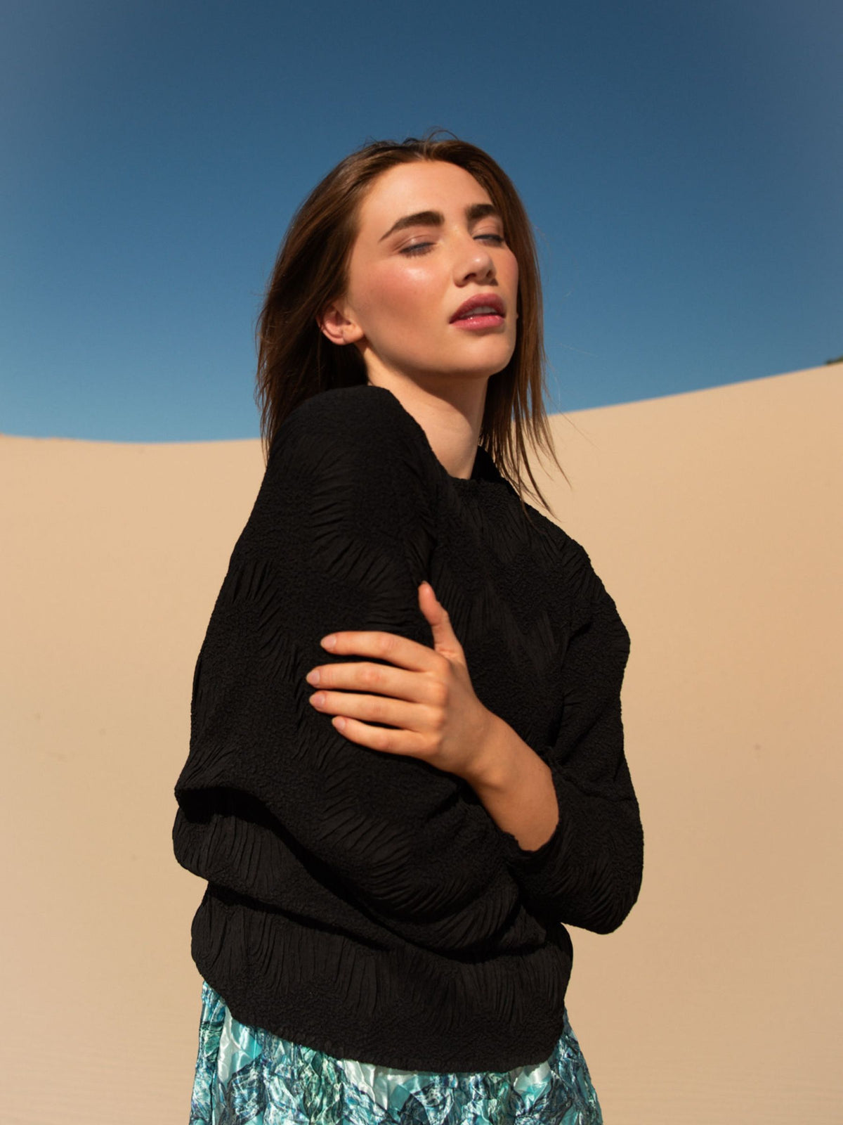 The Cion Top is a modern Alquema essential, designed to bring texture and depth to everyday dressing. Crafted with a richly structured surface, it creates a sculptural finish that subtly catches the light.