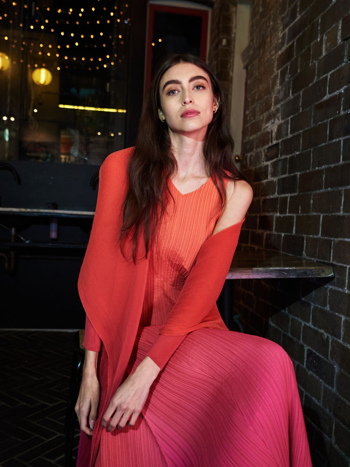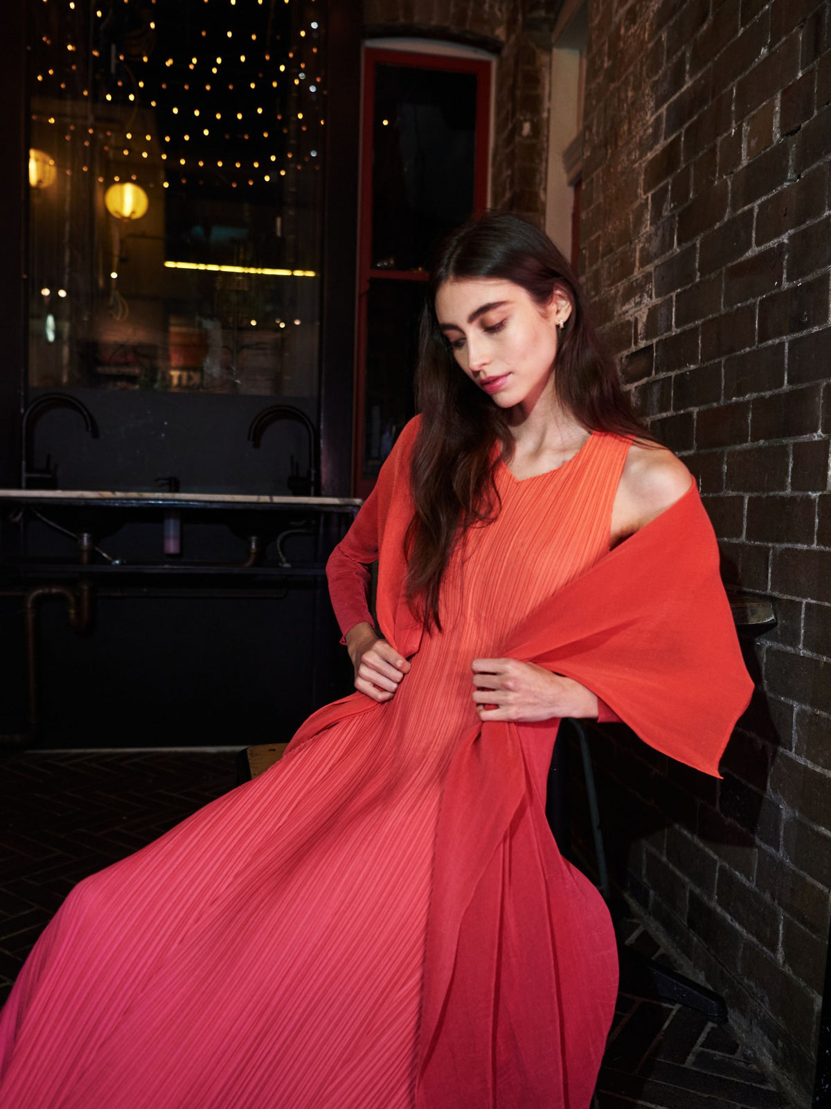The Estrella Dress in Ombre is a luminous harmony of colour and form. Handcrafted with Alquema’s signature vertical pleating, this sleeveless silhouette features a subtle V-neckline and a slim-fitting bodice that gently flares into a full, flowing skirt. The ombré dye technique creates a seamless transition of tones, bringing movement and light to every fold.