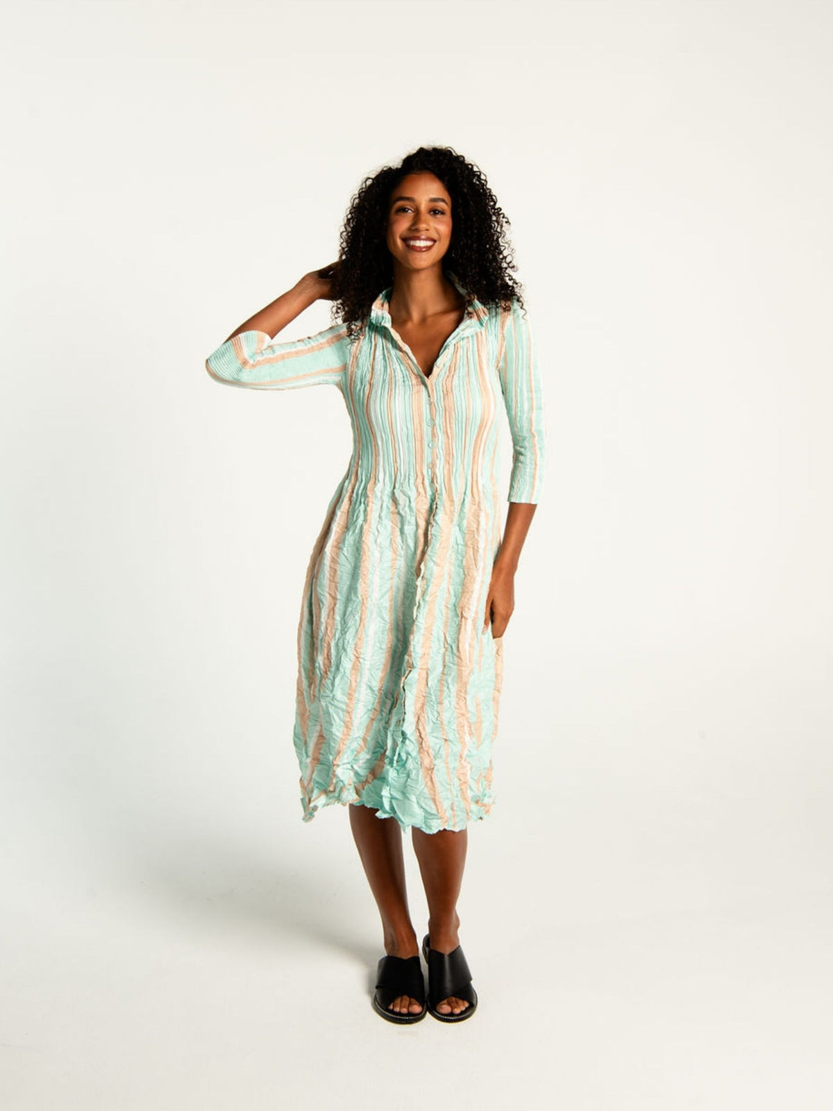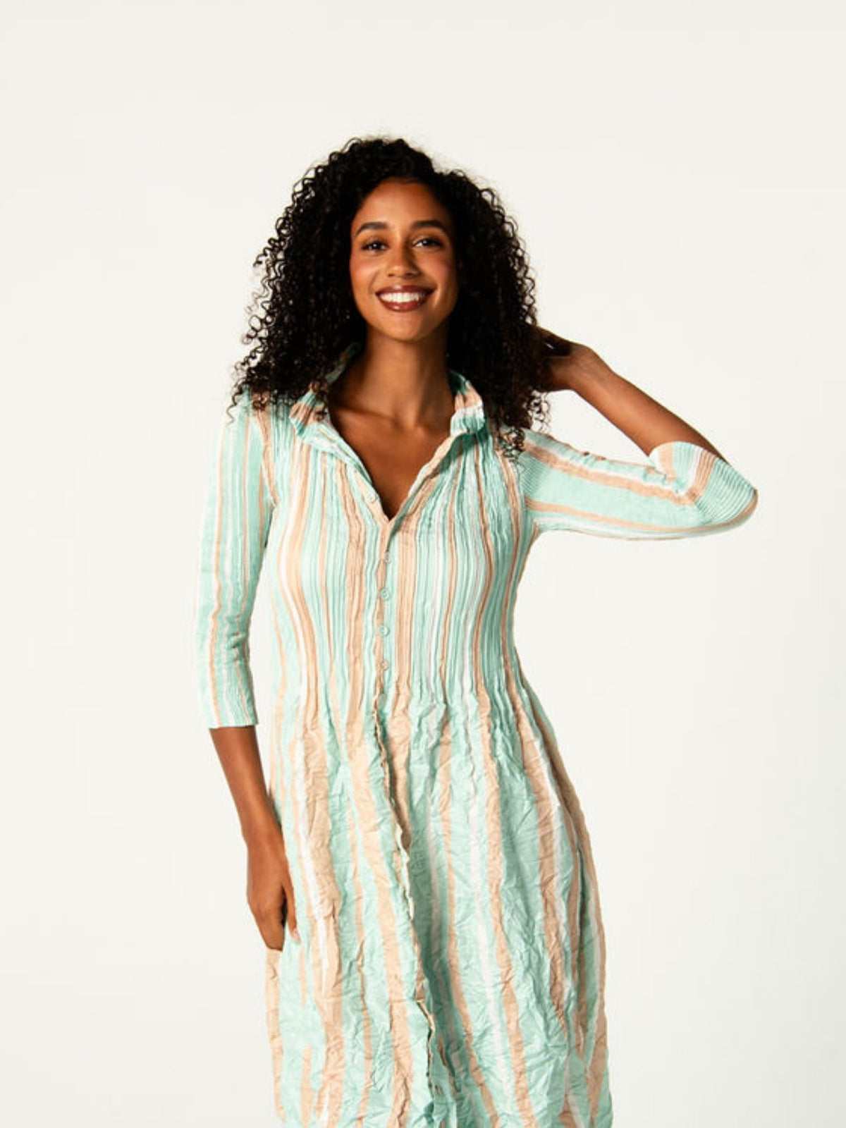 The Nehru Coat Dress is a modern Alquema essential. Crafted in our signature smash-pressed pleats that creates shape and dimension without feeling structured.
