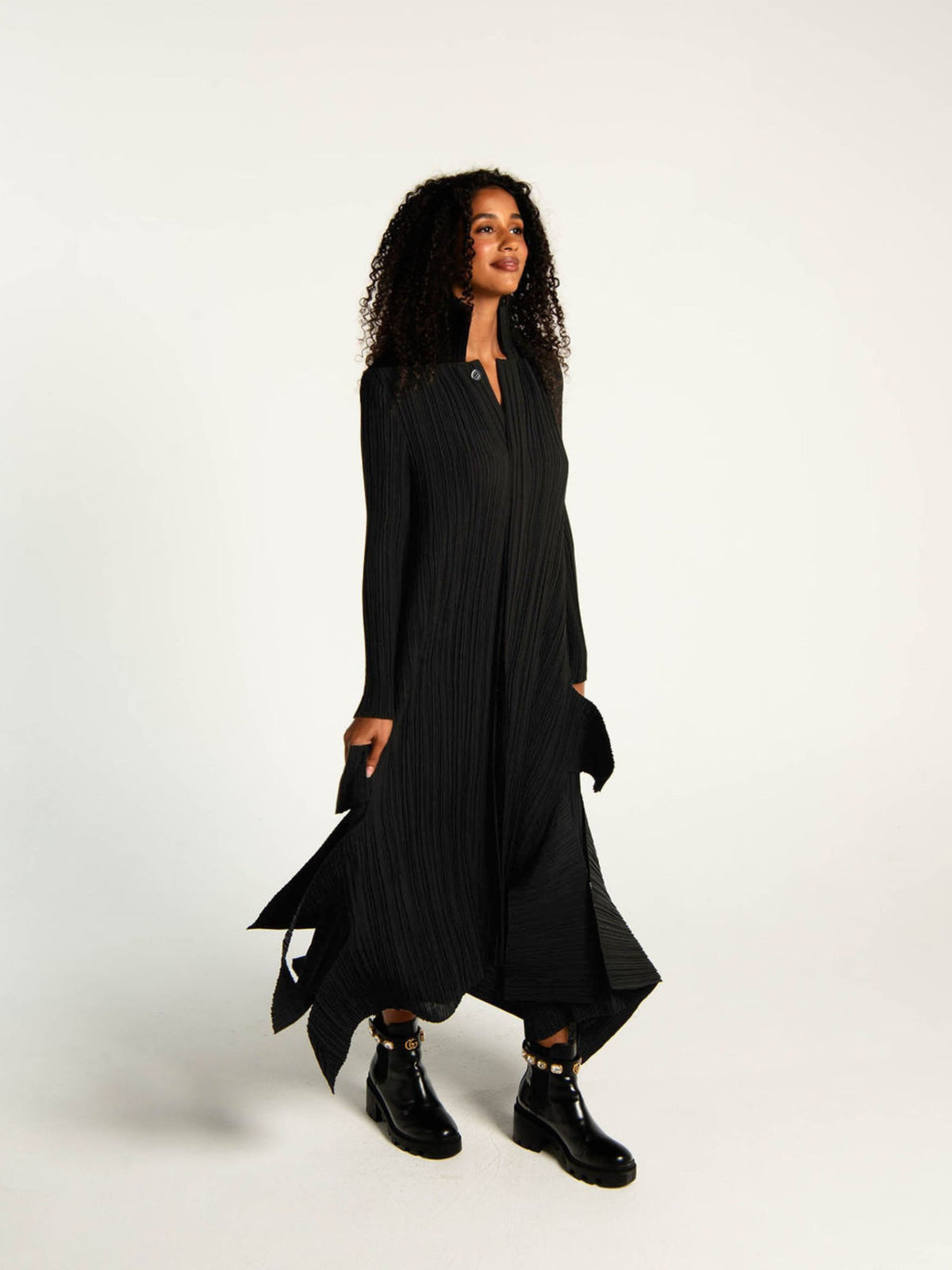 The sculptural side panels create the most striking architecture through the body, opening and folding as you walk to reveal a fluid, fan-like shape. Wear it buttoned through as a dress for a bold, directional moment, or layer it open over matching pleats for an elevated coat-style finish.