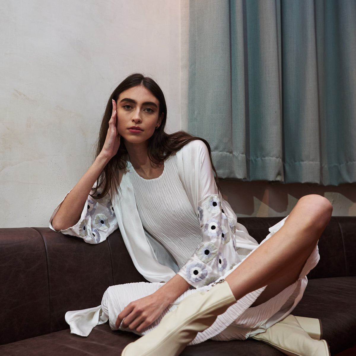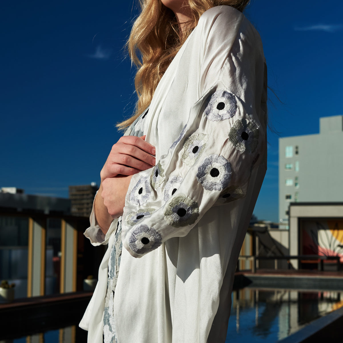 A beautiful 100% Silk Duster harmoniously marries together a myriad of elements, this piece is elegant and refined with a dash of charm. Combining colour and intricate needlework, the flowers hero in this duster, covering the piece in a soft foliage of beauty.