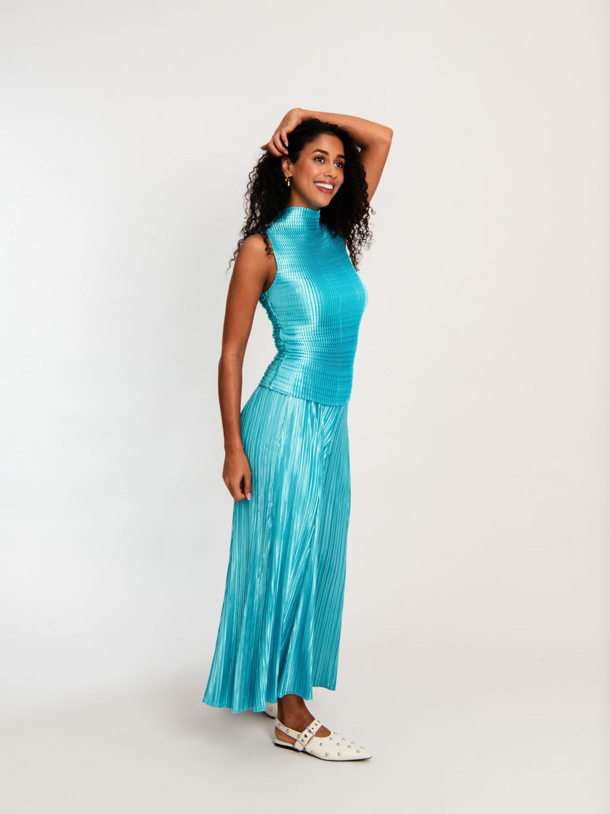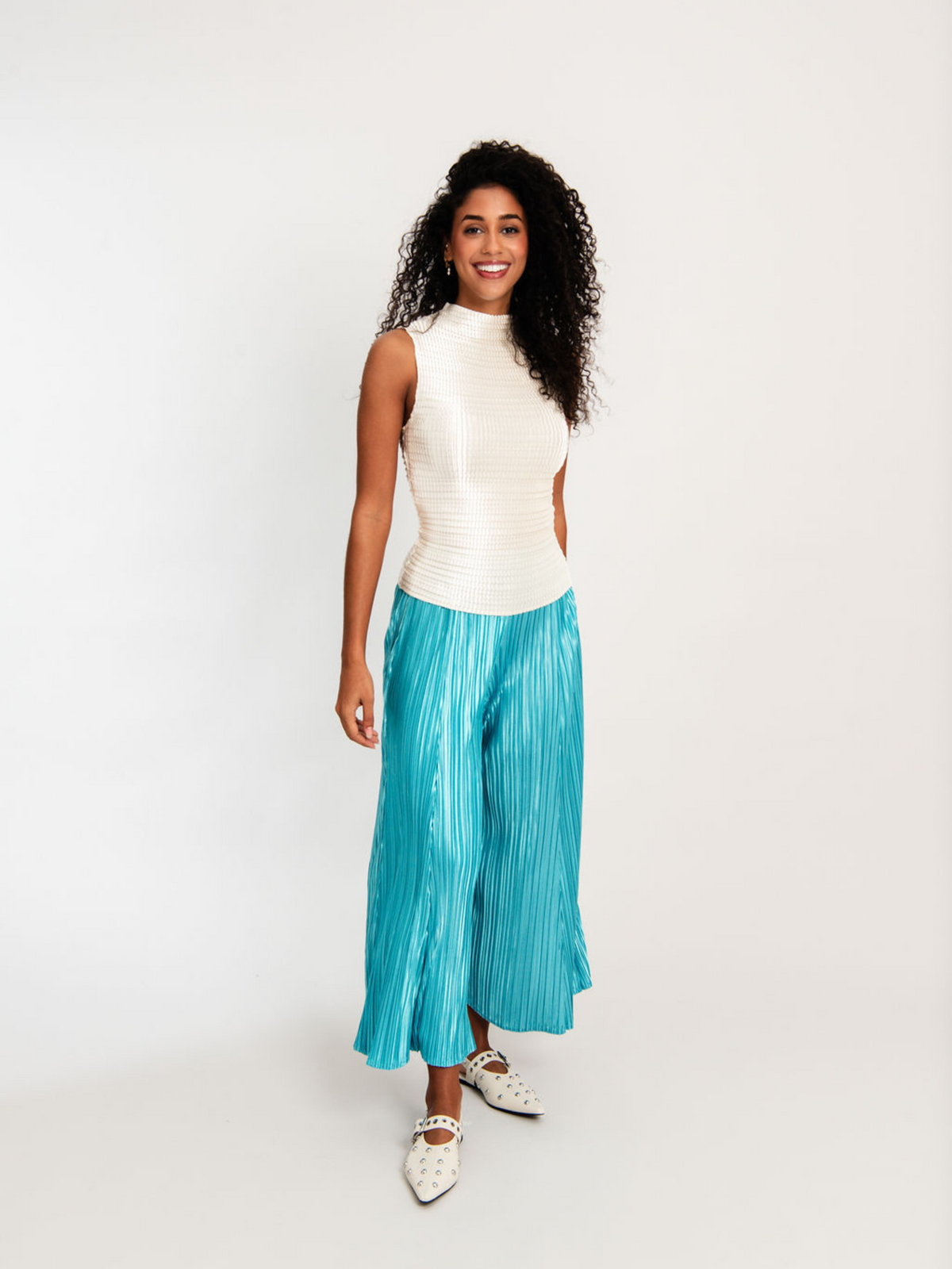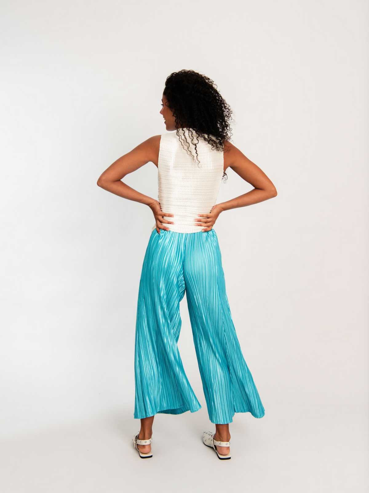A playful take on polished dressing, the Siren Pant shimmers with energy and refined artistry. Crafted from 100% stretch satin with a radiant metallic finish, this cropped, wide-leg style moves effortlessly with the body. Each piece is hand-finished using Alquema’s unique pleating technique, creating a tactile, sculptural silhouette that catches the light with every step. The elasticated waistband ensures ease and comfort, while the pleated design adds texture and dimension.